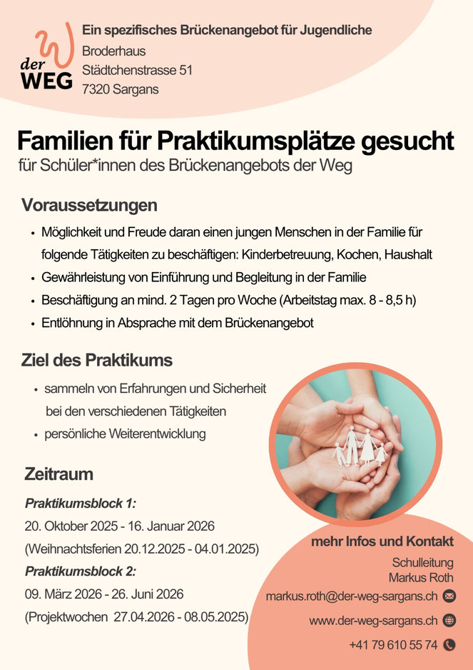 Die Klasse für das Schuljahr 2025/26 (Start am 11. August 2025) ist besetzt. Auskünfte erteilt die Schulleitung unter 079 610 55 74.